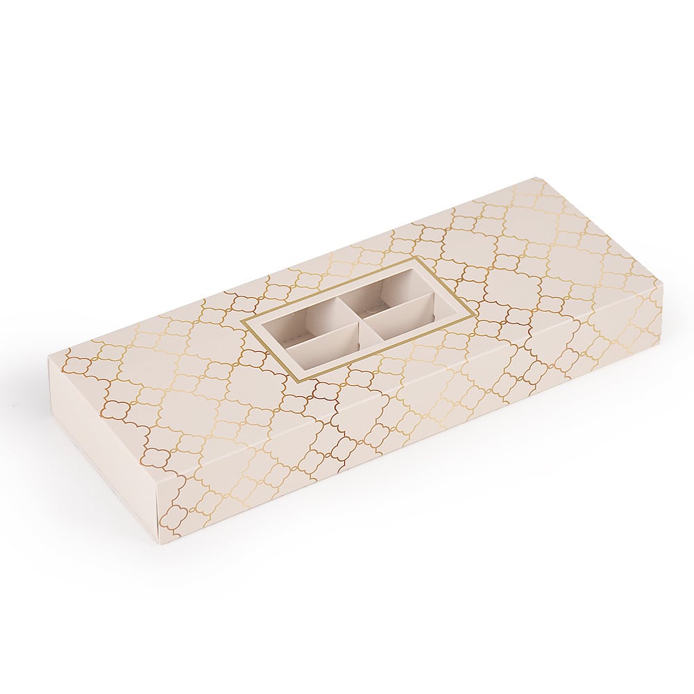 علبة فاخرة للشكولاتة والحلويات بنافذة شفافة اللون بيجي بزخارف ذهبية